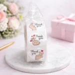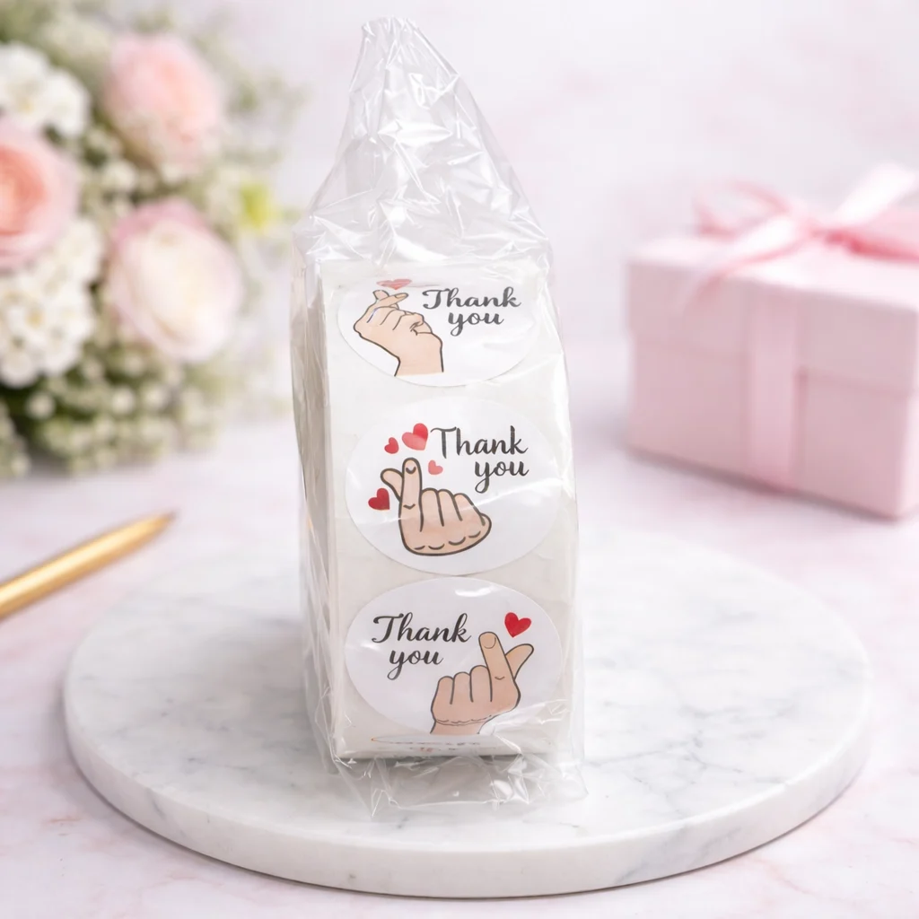 hankyou sticker 1 Roll have 500 pcs sticker. Eco-friendly product it can be used to your cake box’s or brownie box’s.